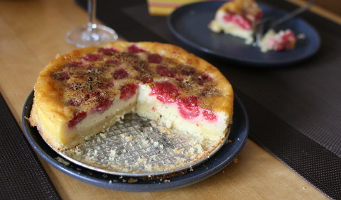 Zufällig hatten wir noch ein kleines Schälchen Himbeeren im Kühlschrank, als ich heute früh über dieses Rezept von Fool For Food gestolpert bin. Wir haben es mit der halben Menge aller Zutaten in einer 18cm-Springform ausprobiert, Puddingpulver und Schote ersetzt durch Stärke sowie gemahlene Vanille, wie man sie am Gewürzstand auf dem Markt bekommt. Vom Teig blieb dabei trotz halber Menge noch etwas übrig, woraus schließlich ein paar Kekse wurden.