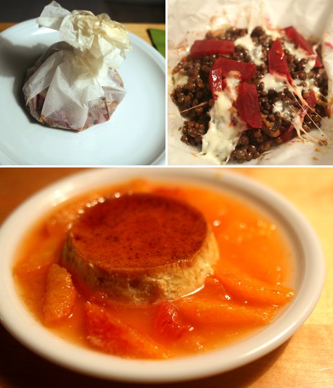 Was man da sieht, sind grüne Linsen mit Roter Bete, Mozzarella und Champignons en papillote (Rezept von Anke), und als Nachtisch Orangenflan (Rezept aus Das große Kochbuch deutscher Köche, Buch völlig aufgelöst und nur noch antiquarisch erhältlich) mit mazerierten Orangen (la mia cucina).