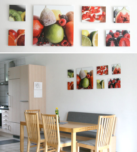 Über unserem Esstisch war jetzt ein Jahr lang eine viel zu große, viel zu weiße Wand. Bald war uns klar, da muss ein Farbklecks hin, Fotografie, insgesamt panoramaformatig und es sollte möglichst mit Essen zu tun haben. Inspiriert von einem Besuch bei Hrn. ichichich, der Makrofotos von Blüten an einer Wand arrangiert hat, durchwühlten wir unsere unzähligen Essensfotos nach möglichst abstrakten Detailaufnahmen von Speisen (ein Haufen Kirschtomaten, eine Pfanne voller Kartoffelwürfel, sowas). Viel Material, alles ganz schick, nur im Gesamteindruck waren wir plötzlich bei einer bebilderten Imbissbudentafel.