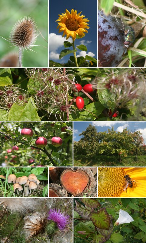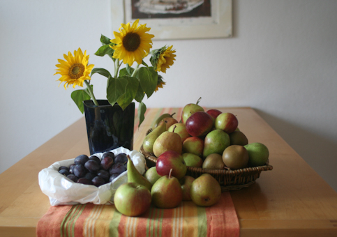 Ein Nachmittag am Walberla in der fränkischen Schweiz, wo die Obstwiesen jetzt in voller Pracht stehen. Die Bäume mit ersten Verfärbungen, pralle Äpfel und Birnen unterschiedlicher Sorten leuchten gelb, hellgrün und rot, vereinzelt hängen sogar noch ein paar Zwetschgen. Dazwischen Sonnenblumen, Disteln, Ranken in denen es immer noch summt, als wäre der Sommer noch nicht zuende, und zwischen frischgrünem Löwenzahn springen Grashüpfer über unsere Füße. Die Luft ist kühl, doch die Sonne wärmt, so dass ich den Pullover bald ausziehe. Wir schlendern zwei, drei Stunden im weichen Herbstlicht durch die Felder am Fuß des Hügels, saugen uns voll mit Wärme und Farben und pflücken nach und nach so viel Obst, dass wir einigermaßen bepackt uns am Ende die letzten Meter den Felsen hinauf sparen, wo die ganzen anderen Sonntagsspaziergänger jetzt entlangstiefeln und lieber zufrieden heim fahren, wo